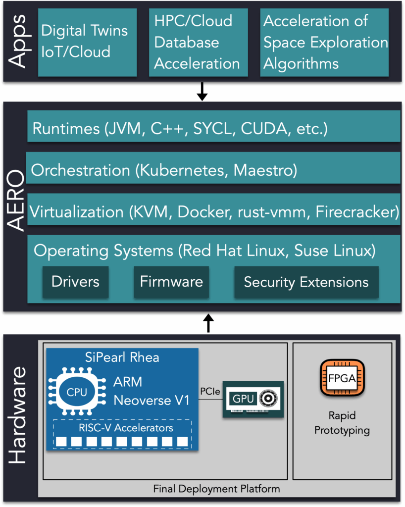 The AERO software ecosystem spans the full cloud computing stack. It includes operating systems, compilers, runtimes, system software, and auxiliary deployment and management services. These components are enhanced with novel software–hardware interfaces designed to seamlessly exploit the heterogeneous nature of the EU processor. This approach allows cloud workloads to benefit from high performance, improved energy efficiency, and built-in security features, while remaining compatible with established cloud development and deployment practices. A strong emphasis is placed on open-source development, ensuring transparency, interoperability, and long-term sustainability. By contributing improvements upstream and building on widely adopted technologies, AERO lowers barriers for developers, cloud providers, and industrial users who wish to experiment with or migrate to EU-based cloud infrastructures. This openness is key to fostering a vibrant European ecosystem around the EU processor, extending well beyond the project’s lifetime. AERO also focuses on ease of migration for existing cloud customers. One of its core objectives is to enable organizations to transition their workloads to EU processor-based infrastructures with minimal effort, avoiding costly rewrites or vendor lock-in. By aligning with common cloud frameworks, virtualization technologies and orchestration tools, the project ensures that familiar workflows can be retained while benefiting from EU hardware innovation.
