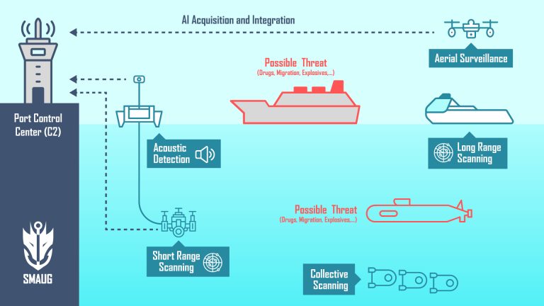 The SMAUG project aims to transform security monitoring in maritime ports all over the EU by delivering advanced capabilities for security management to enhance the detection of risks within the port facilities and their associated entry points. This effort is to be met by creating an integrated system including advanced components that meshes seamlessly together. The project will utilize cutting-edge AI algorithms to enhance the accuracy of security assessment by tapping into information from EU Maritime Ports. The SMAUG system is methodically designed to provide a huge mass of data for very delicate threat assessments, drawing together information from three fundamental components: the Security Infrastructure of ports, Front Line Underwater Detection Systems and Vigilant Surveillance Vessels.